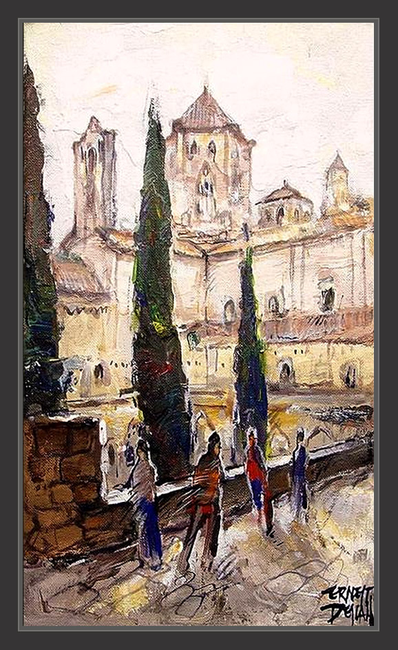 SANTA MARIA DE PALAUTORDERA-PINTURA-PLAÇA MAJOR-TERRASSES-RESTAURANTS-ESGLESIA-PAISATGES-POBLES-MONTSENY-PINTURES-PINTOR-ERNEST DESCALS-